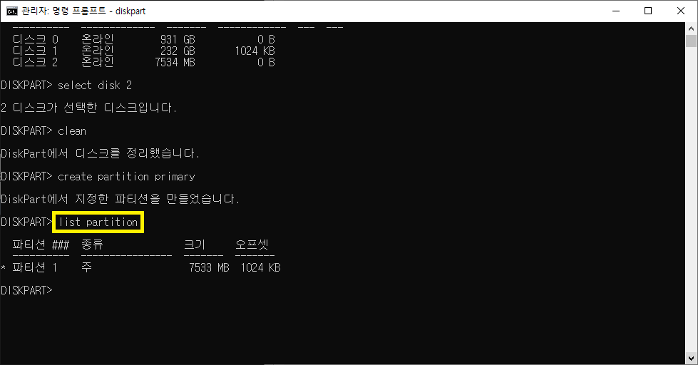: 위 명령어를 통해서 USB의 파티션을 설정해줍니다.