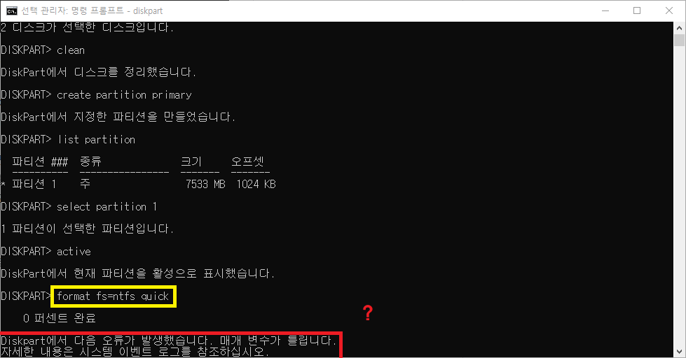 윈도우용 부팅디스크를 만들었던 USB라거나 등등 다양한 원인 미상의 이유로, 명령어가 안먹히고 "0 퍼센트 완료 Diskpart에서 다음 오류가 발생했습니다. 매개 변수가 틀립니다. 자세한 내용은 시스템 이벤트 로그를 참조하십시오." 라는 문구가 뜨게 되는 경우가 있습니다. 이분들도 걱정 마시고 아래의 USB 포맷방법을 쭉 따라와 주세요.