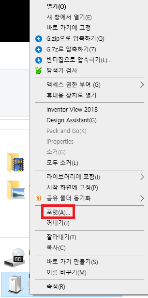 그 전에는 인식이 안되서 아이콘, 장치 이름, 용량 등이 하나도 안보이고 있었건만, 드디어 내 컴퓨터에 USB 아이콘이 나타나게 되는데요. USB 아이콘에 마우스 커서를 갖다대고 오른쪽 클릭을 하여 [포맷]을 눌러줍니다.