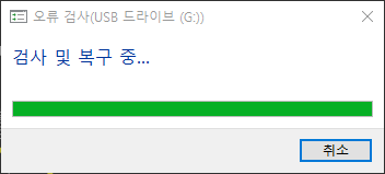 위 사진에 있는 것 처럼 팝업창에서 무언가 버튼을 누르라고 권장하고 있는 것 같은데, 누르지 말아주세요. 어차피 [스캔 및 수정(권장)]을 누르면 "이 드라이브에서 오류가 발견되었습니다. 데이터 손실을 방지하려면 이 드라이브를 지금 복구하십시오." 라는 팝업이 뜨게되고, 드라이브 복구를 하라고 합니다. 복구를 누르면, "드라이브 검사했습니다. 오류가 발견되지 않았습니다." 라고 팝업창이 뜹니다.