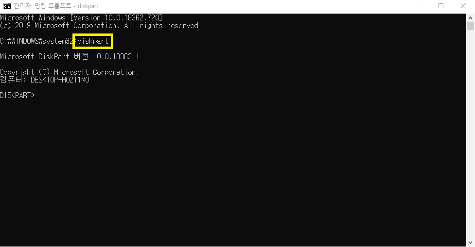 : 명령어를 적고 엔터를 치시면 됩니다. 디스크파트의 하위명령어를 작성하기 위함입니다.
