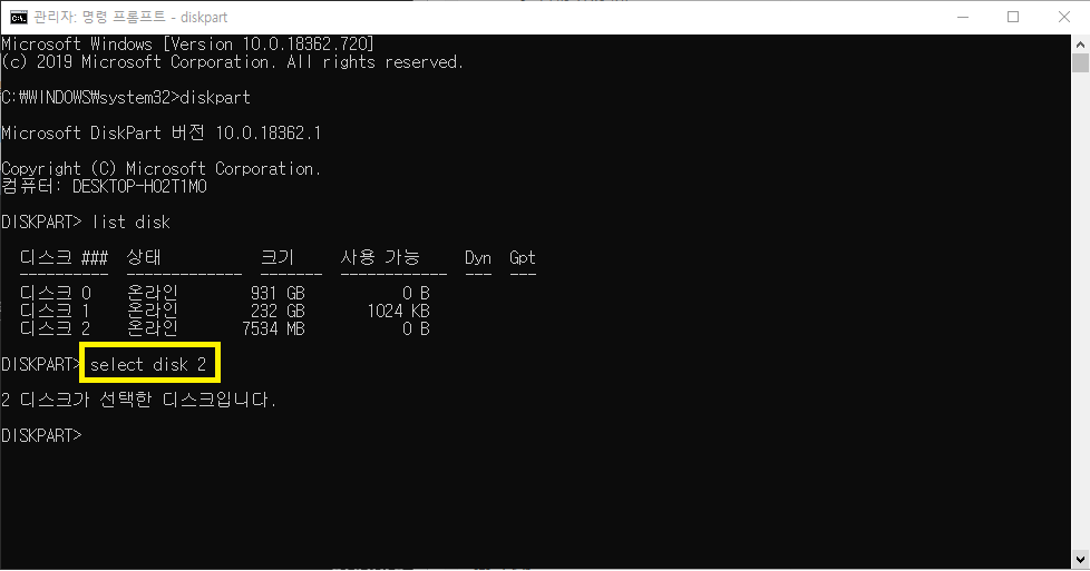 : 필자의 경우 디스크2 가 USB였어서 select disk 2를 입력한 것이고, USB가 디스크1로 되어 있으시면 select disk 1을 입력하시면 됩니다.